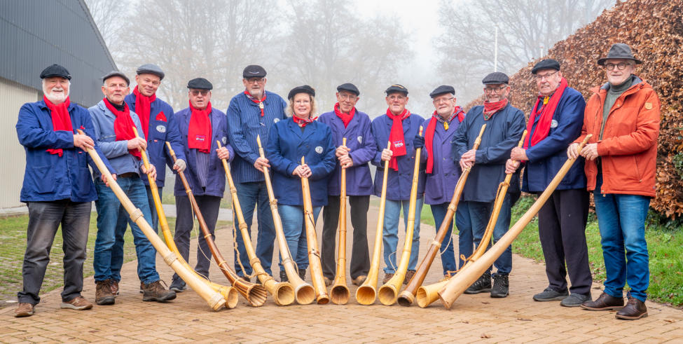 Welkom op de site van de Midwinterhoornblaasgroep De Ekelbloazers uit Zuidwolde  Sinds 2012 horen we in Zuidwolde rond de Kerstdagen weer het geluid van de midwinterhoorn afkomstig uit de hoorns van ruim 15 zeer enthousiaste leden van De Ekelbloazers.  Een blaasgroep die de oude Germaanse traditie weer heeft opgepakt. Zij noemen zich "De Ekelbloazers". Ekel is een Germaans woord dat de betekenis heeft van walging, afkeer. Het blazen op de midwinterhoorn was volgens sommige verhalen om de akelige boze geesten  te verdrijven, de winterse duisternis te keren en het was een vorm van onderlinge communicatie van de  nomaden/herders van weleer. Ook in Zuidwolde was een plek die men in het verleden niet graag wilde betreden. De Ekelenberg. Dit zou de “akelige berg” of  “berg des afkeers” zijn.  Dat klopte ook wel. Want er dwaalden geesten rond en van ouds woonde hier een 'wit wief'  of zoals we hier zeggen een 'spinwiefien'.  De midwinterhoorn was van oorsprong gemaakt van de runderhoorn van de hier levende oerossen.  Tegenwoordig wordt de hoorn gemaakt uit een kromme stam van een berk, els, wilg of es.   In Drenthe was het gebruik van dit soort hoorns, o.a. ook van de boerhoorn verloren gegaan. In Twente en de Achterhoek is deze traditie altijd door de geslotenheid van het gebied gehandhaafd.  Nu in deze tijd waar we niet meer zoveel drukte maken om boze geesten en de social media voor   zeer snelle communicatie zorgt is de midwinterhoorn tot een folkloristisch gebruik geworden. Maar  wel een gebruik met strikte oude normen die wel in de loop van de jaren verchristelijkt is.  Zo is de periode waarin men buiten mag blazen beperkt van de eerste zondag van de Advent  (1 december 2024) tot en met Driekoningen op 6 januari.    Thans is deze folklore niet meer alleen in Twente en de Achterhoek in gebruik. Op heel veel andere  plekken in Nederland en Duitsland wordt er al dan niet in groepsverband geblazen.   In 2013 organiseerden wij voor de eerste keer onze Midwinterhoorn Kuiertocht. De omgeving van Zuidwolde leent zich er uitstekend voor om een zeer gevarieerde wandeltocht in samenwerking met meerder blaasgroepen te verzorgen. Het werd een doorslaand succes en tegenwoordig een jaarlijks terugkerend evenement op de 1e zondag van de Advent. (kijk voor meer informatie de pagina Kuiertocht)  Vanaf medio oktober tot begin december komen de Ekelbloazers elke woensdagmiddag bij elkaar en proberen zij zich daar de kunst van het blazen verder eigen te maken.   Wilt u meer weten van deze mooie traditie, of wilt u ook een toontje op de hoorn mee blazen neem dan contact met ons voor nadere informatie.